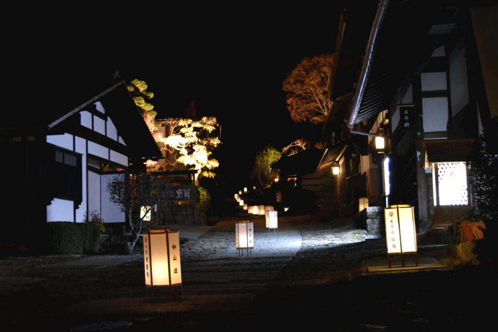 夜の馬籠宿の街道沿いに行灯を並べ明かりを灯す「あかり街道」と、もみじのライトアップを行う